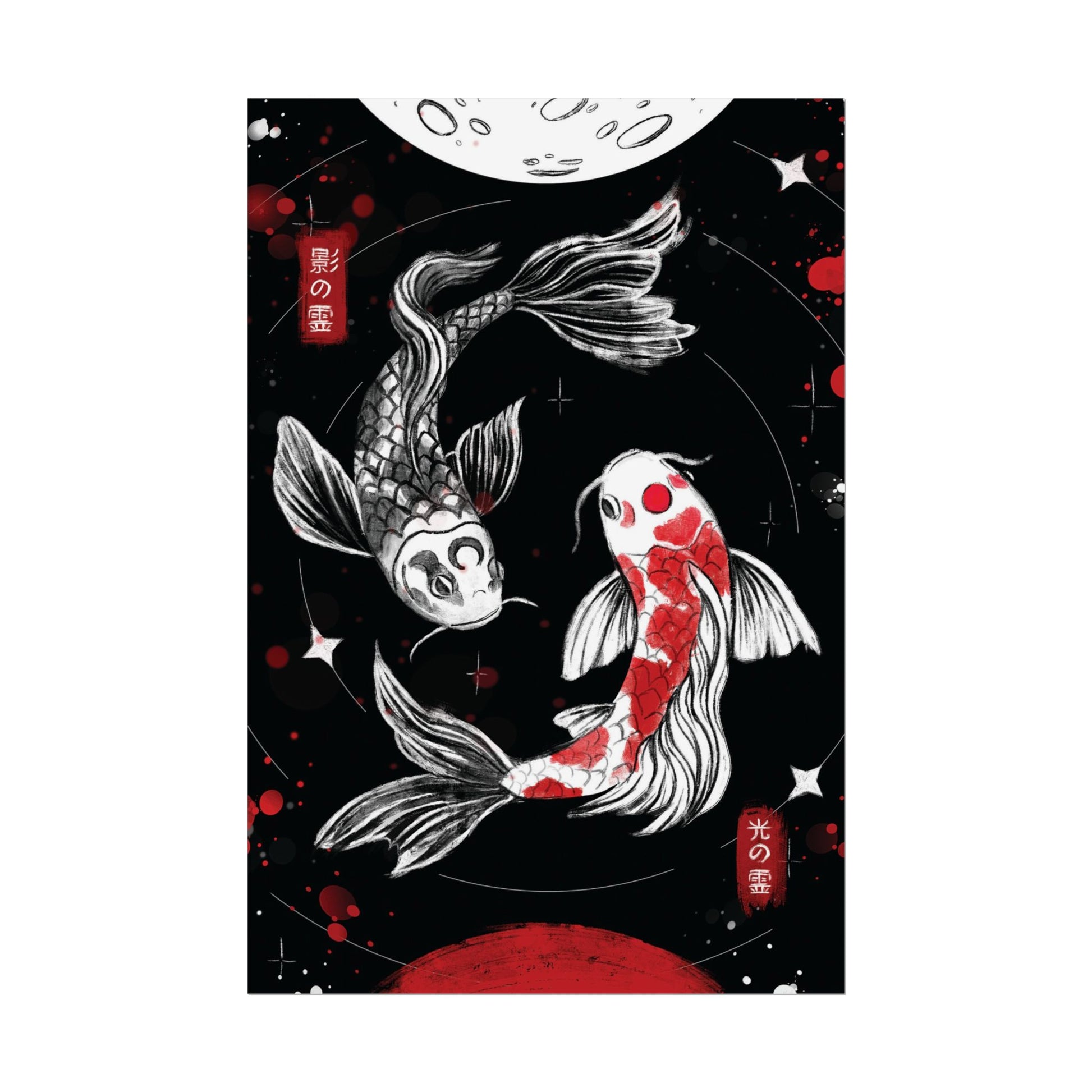 Two koi swim in a gentle circle, their movements mirroring each other in perfect balance. The contrast of their colors reflects harmony and calm. Soft brushstrokes give the scene a quiet, flowing energy.