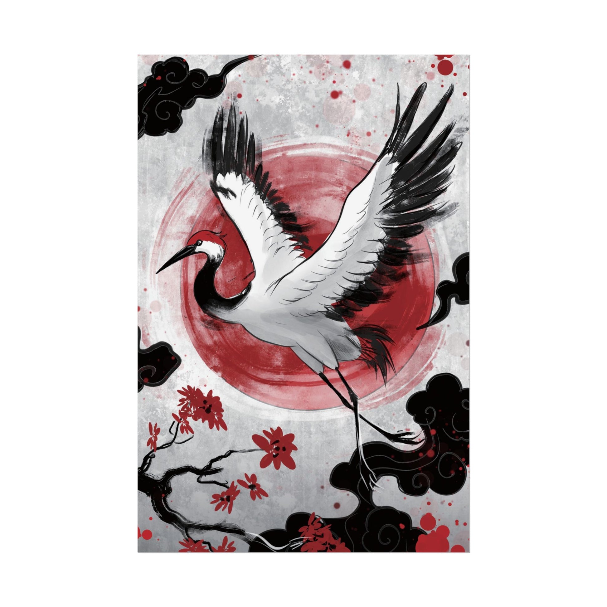 A graceful crane rises into the air, its wings cutting through swirling clouds beneath a bold red sun. The ink-brush style gives the scene a timeless, almost meditative energy, blending motion with stillness. Black and white feathers contrast sharply against the vivid red circle, symbolizing strength, balance, and renewal. Cherry blossoms drift quietly below, hinting at fleeting beauty and the passing of seasons. Together, these elements create a moment where nature, elegance, and tradition meet in a single soaring flight.