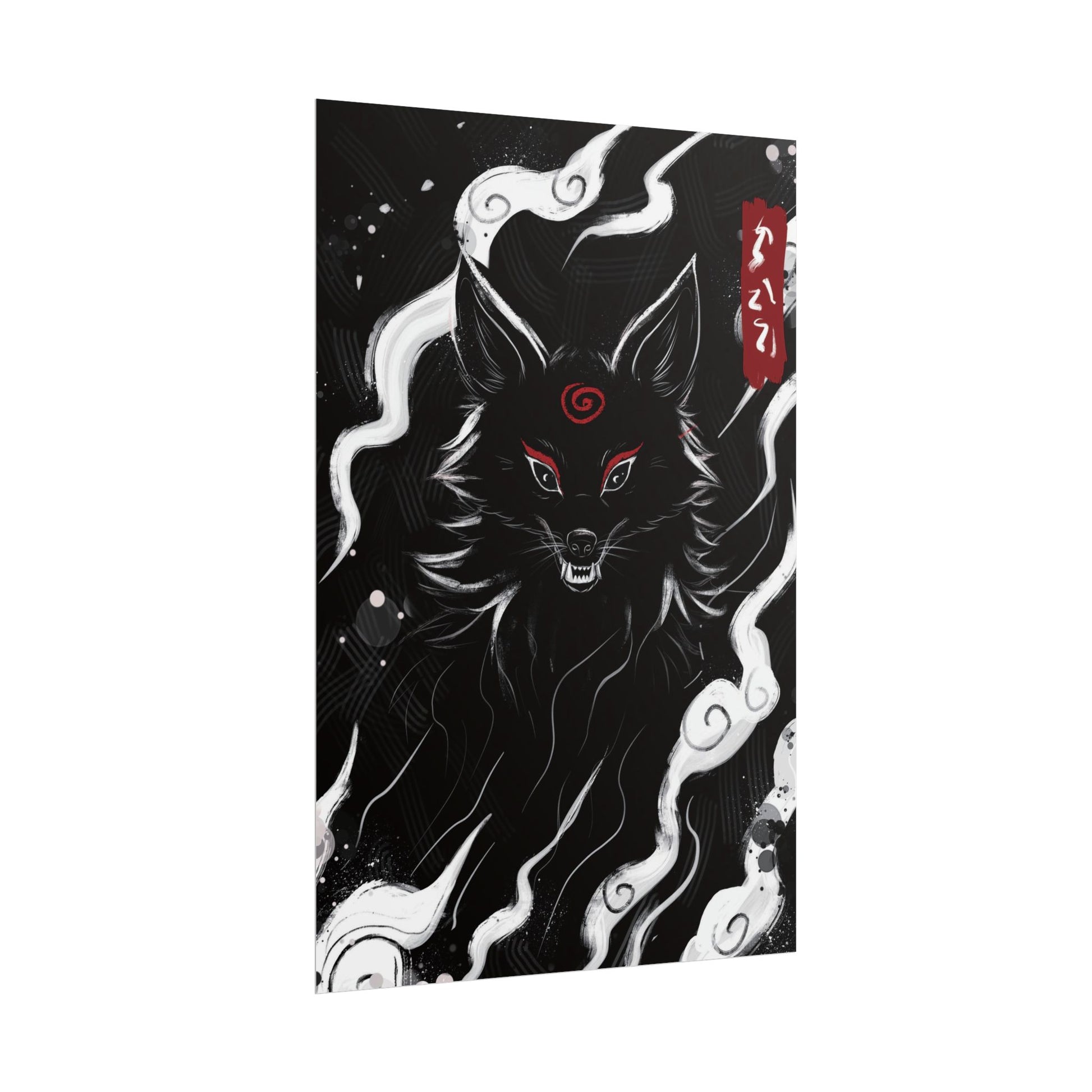 The wandering fox spirit of Japanese folklore moves quietly through drifting clouds beneath a crimson sun. Known for their clever nature and shapeshifting powers, these spirits often blur the line between mischief and mystery. The ink-brush style reflects traditional Japanese aesthetics, giving the scene a timeless and mystical feel. Dark clouds and red blossoms frame the spirit’s presence, hinting at a world where nature and the supernatural meet. In the stillness of the moment, the fox spirit lingers, watching from the shadows.